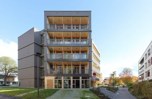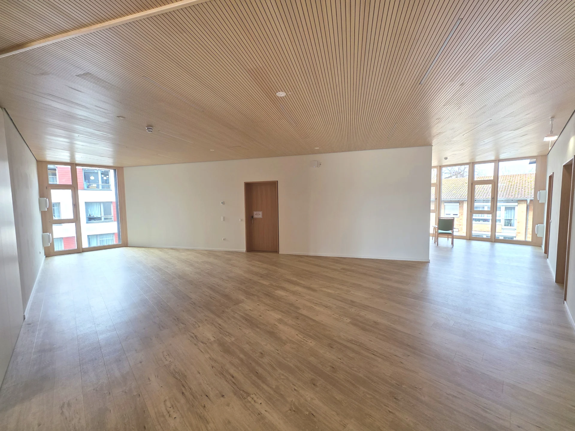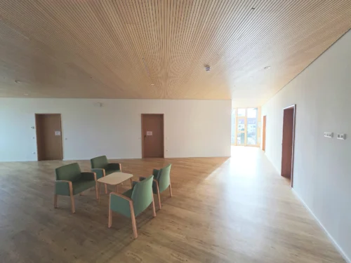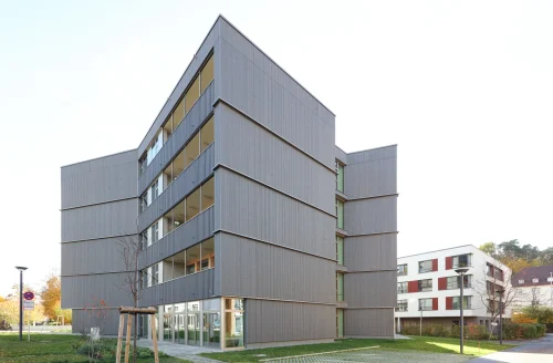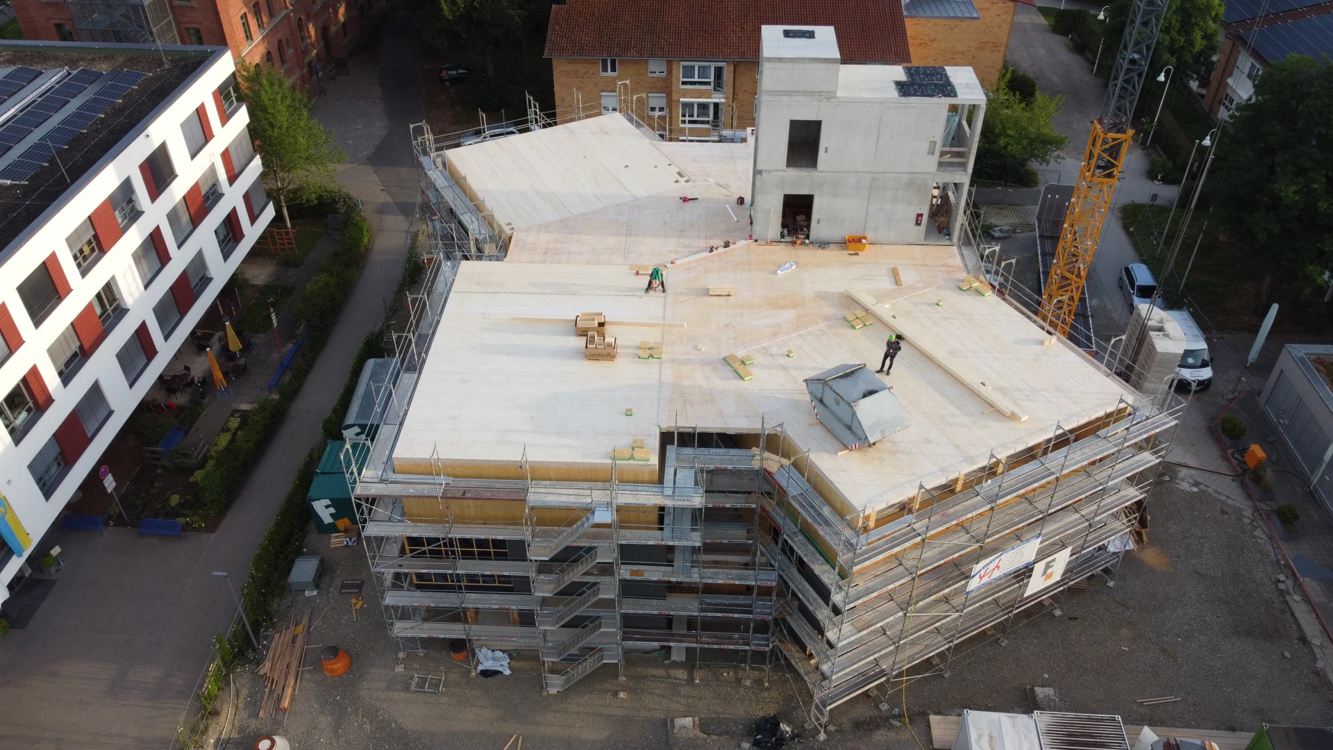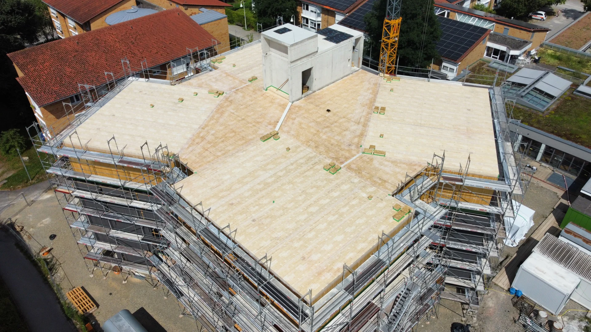 Sprechen wir mal über Nachhaltigkeit. Das neue Gebäude des Spitals Biberach ist nämlich ein absolutes Paradebeispiel für nachhaltiges Bauen. In dem fünfgeschossigen Holzhybridbau haben wir nahezu 1.000 Kubikmeter Holz verbaut, was rund 2.500 Festmetern entspricht – die gänzlich aus dem eigenen, 1.600 Hektar großen Waldbesitz des Spitals stammen.