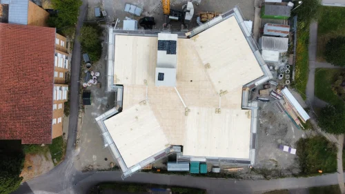 Das gesamte Holz wurde von der Firma Schneider in der Region weiterverarbeitet, die die Holzbalken und -elemente dann direkt auf unsere Baustelle lieferte. Insgesamt waren dabei rund 40 LKW-Ladungen Material unterwegs, weshalb es sinnvoll ist, die Anfahrtswege so kurz wie möglich zu halten. Wenn man also auch mit einem Projekt dieser Größenordnung in der Region bleibt, spart das enorm viel Sprit, Zeit und Geld. Und das ist dann wirklich nachhaltig.
