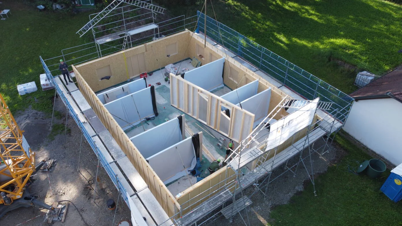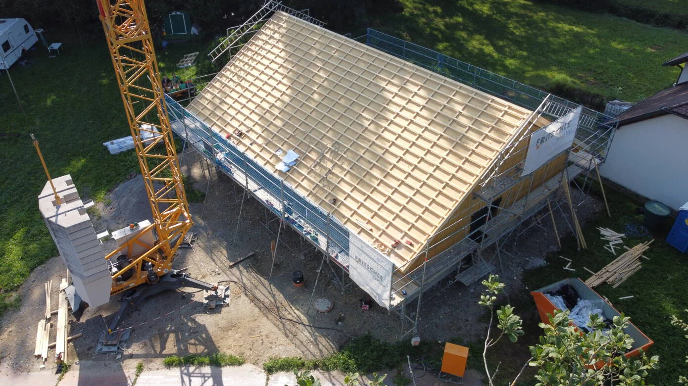 Anfang August errichteten wir in Tiefenbach ein Einfamilienhaus und stellten die dafür notwendigen Holzrahmenbauwände zum ersten Mal in Eigenregie in unserer Zimmerei in Vorfertigung her. Die für das Gütesiegel erforderliche Fremdüberwachung durch die GDF – bei der wir seit Kurzem nun auch Mitglied sind – wurde bei uns im Werk sowie auf der Baustelle durchgeführt.