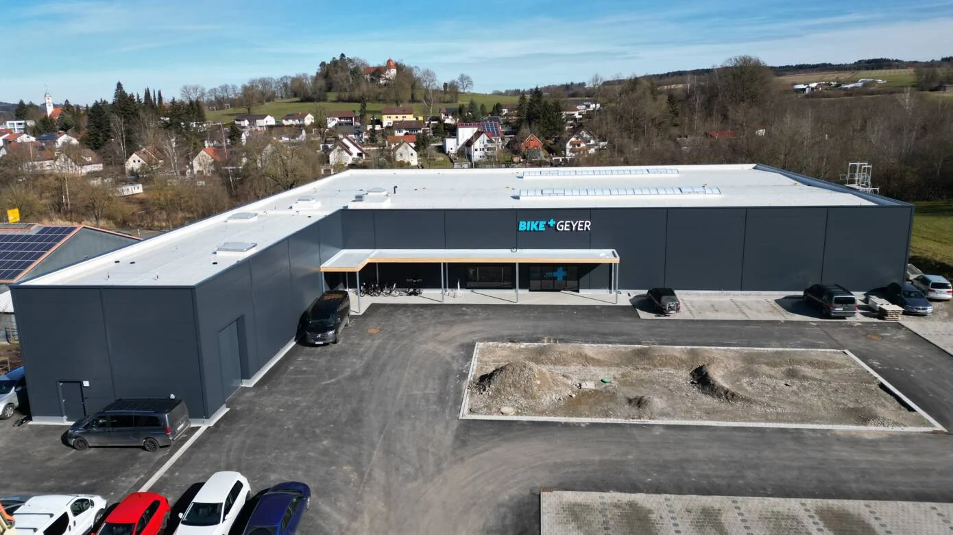 Auf 2.200 m² ist in Hanglage ein zweistöckiges Gebäude mit Zwischenebenen entstanden, mit einem fast 1.400 m² großen Bike-Showroom, Anlieferungsbereich, Lager, Werkstatt, Büros und Sozialräumen. Wer uns kennt, weiß, dass uns die Umwelt und ein hoher Energiestandard am Herzen liegen. Darum wurde bei Geyer in Bad Wurzach eine PV-Anlage auf dem Flachdach installiert, die den Strom für eine Wärmepumpe liefert. Außerdem haben wir im KfW-40-Standard gebaut und ein Holztragwerk errichtet, auf dem Sandwichplatten befestigt sind.