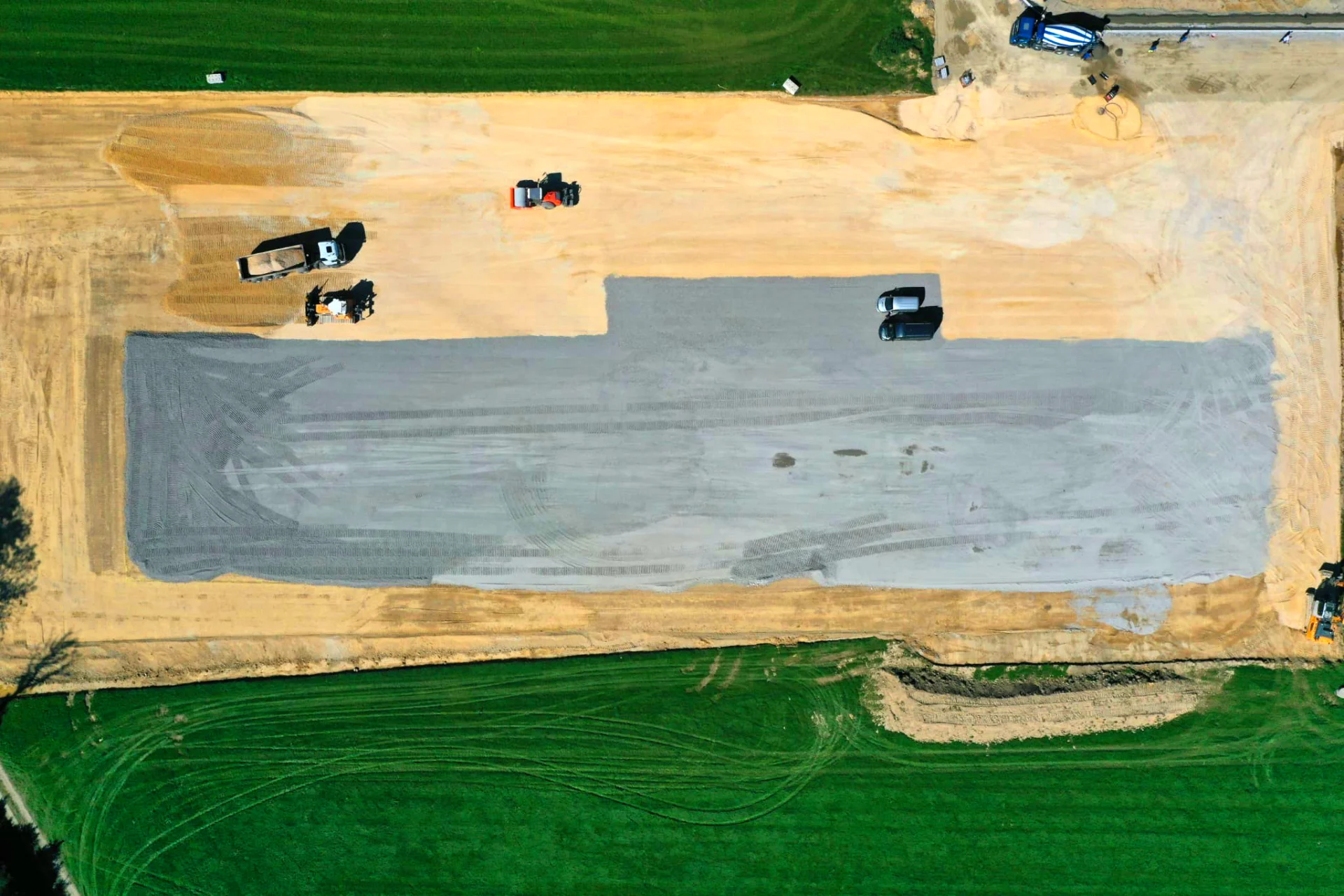 Durch den Einsatz von Beton RC (grau) im Bereich der Halle und Kalkschotter (weiß/gelb) im Bereich der Außenanlage/Hoffläche als Tragschicht, ergibt sich ein optischer Unterschied.