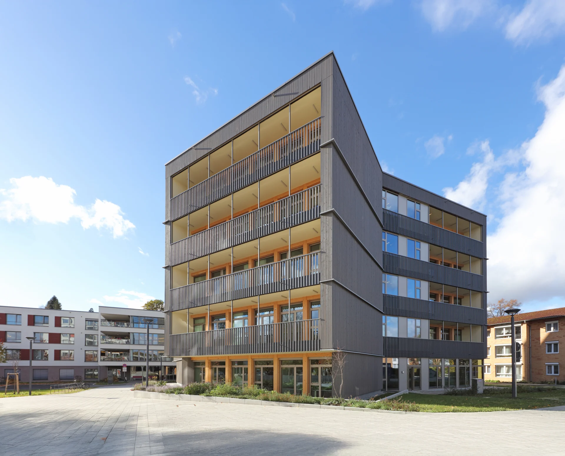Sprechen wir mal über Nachhaltigkeit. Das neue Gebäude des Spitals Biberach ist nämlich ein absolutes Paradebeispiel für nachhaltiges Bauen. In dem fünfgeschossigen Holzhybridbau haben wir nahezu 1.000 Kubikmeter Holz verbaut, was rund 2.500 Festmetern entspricht – die gänzlich aus dem eigenen, 1.600 Hektar großen Waldbesitz des Spitals stammen.