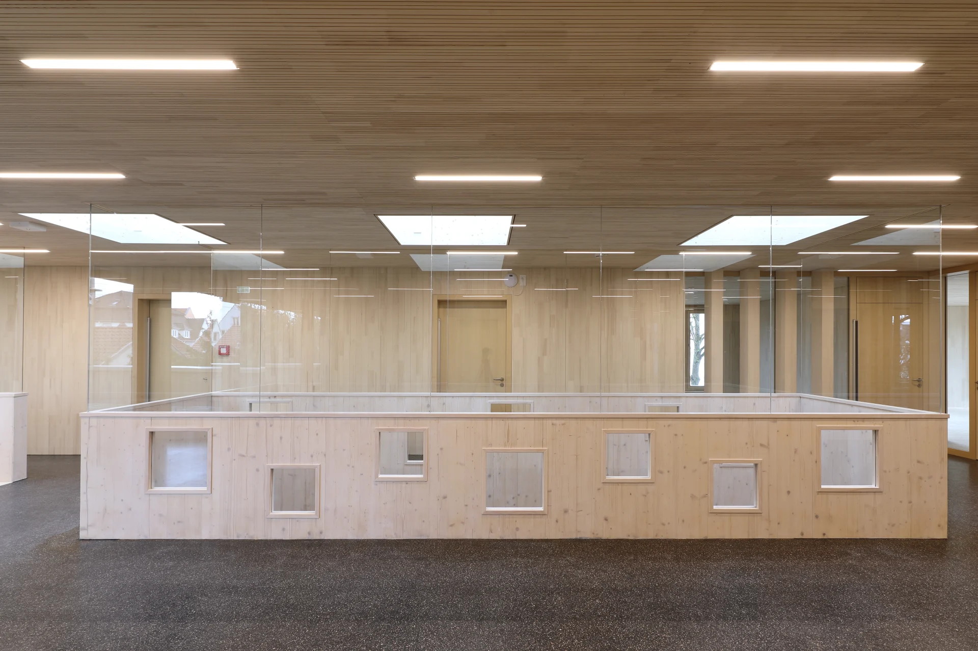 Es handelt sich hier um einen Holzhybridbau. Die Decken sind aus Holz-Beton-Verbund gefertigt. Neben der geschlossenen Hülle waren wir für sämtliche Holzbauarbeiten, die Dachabdichtung und Flaschnerarbeiten verantwortlich.