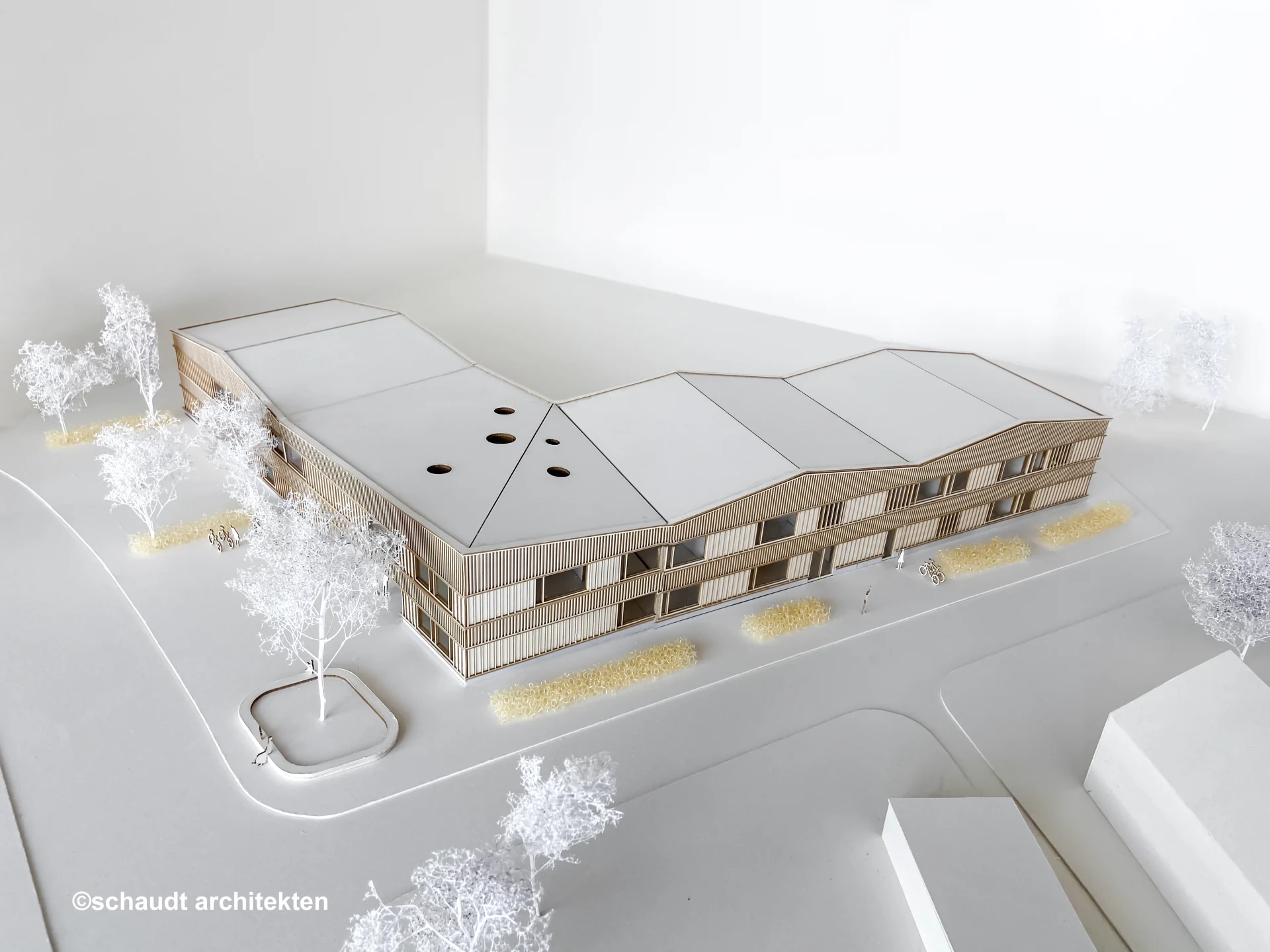 L-förmigen Holzneubau. Zukünftig werden den Kindern über 450 m2 zur