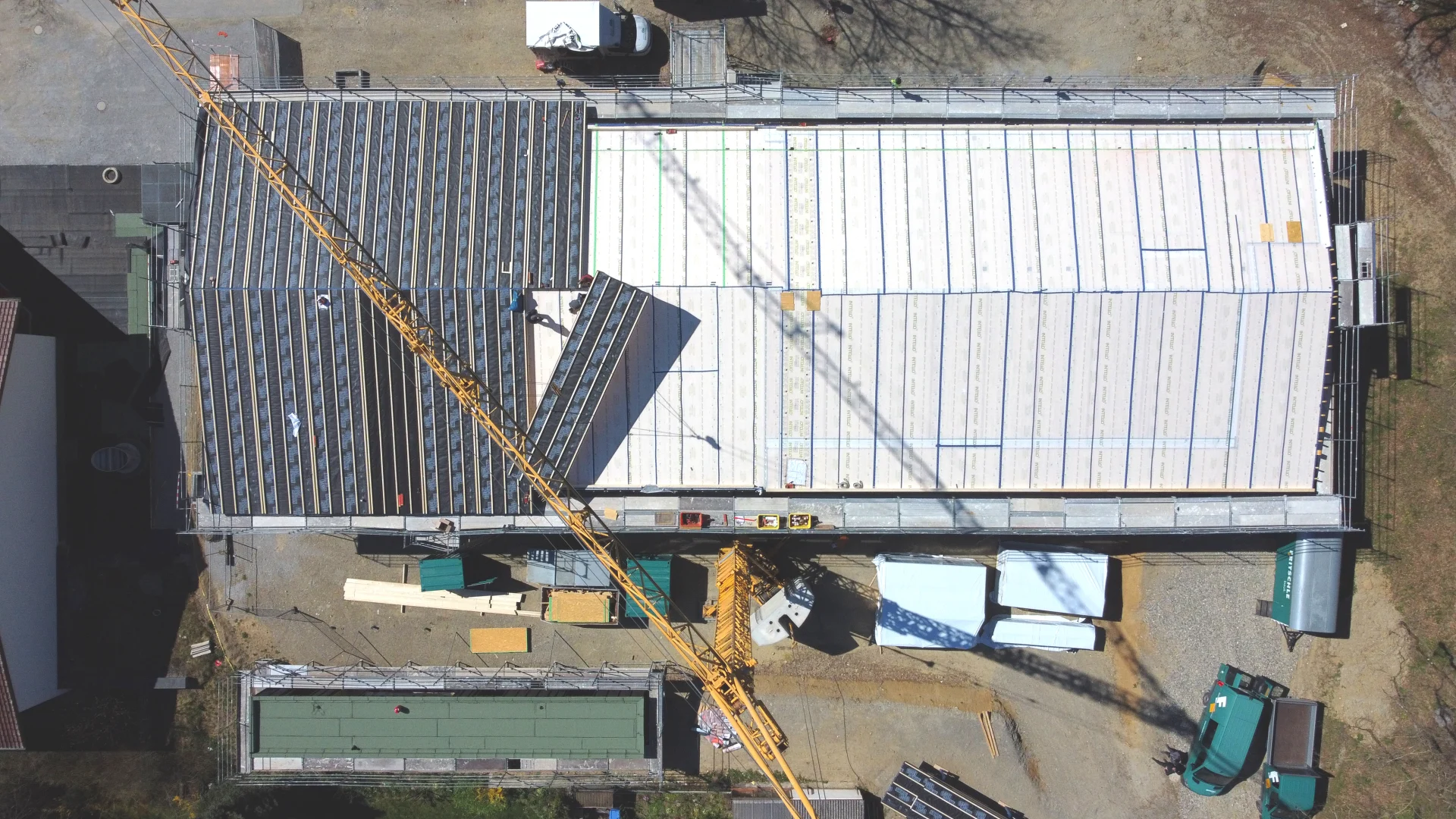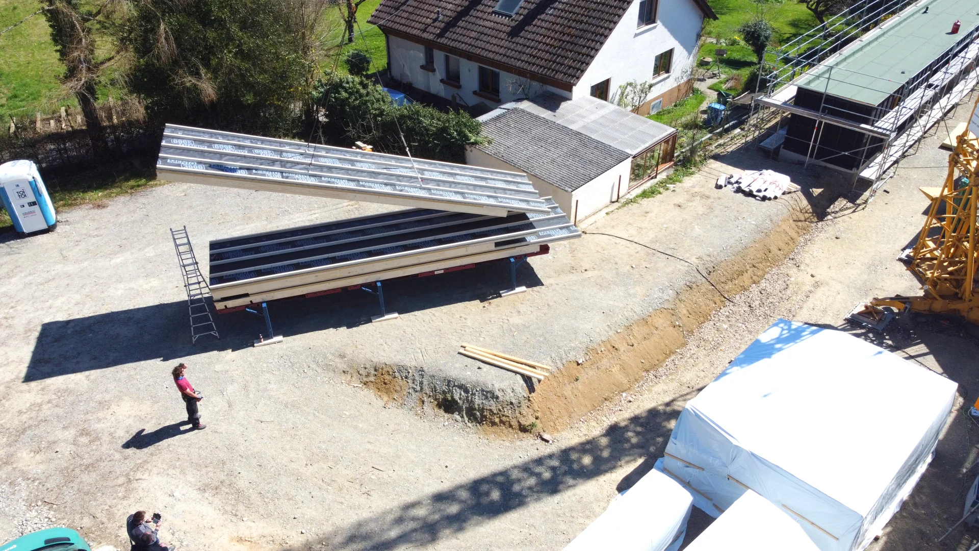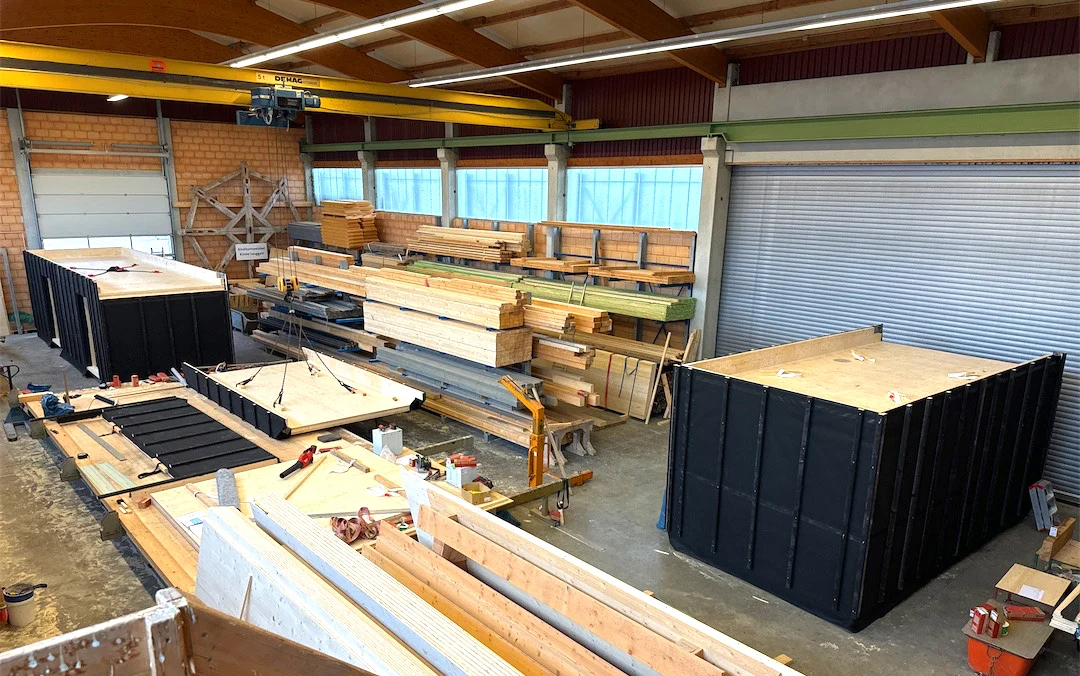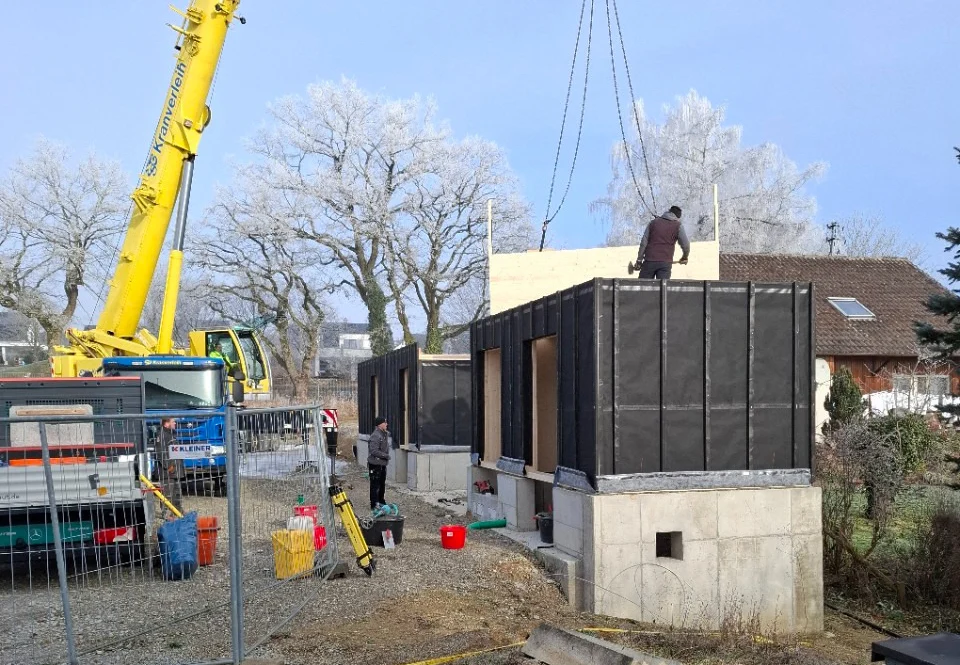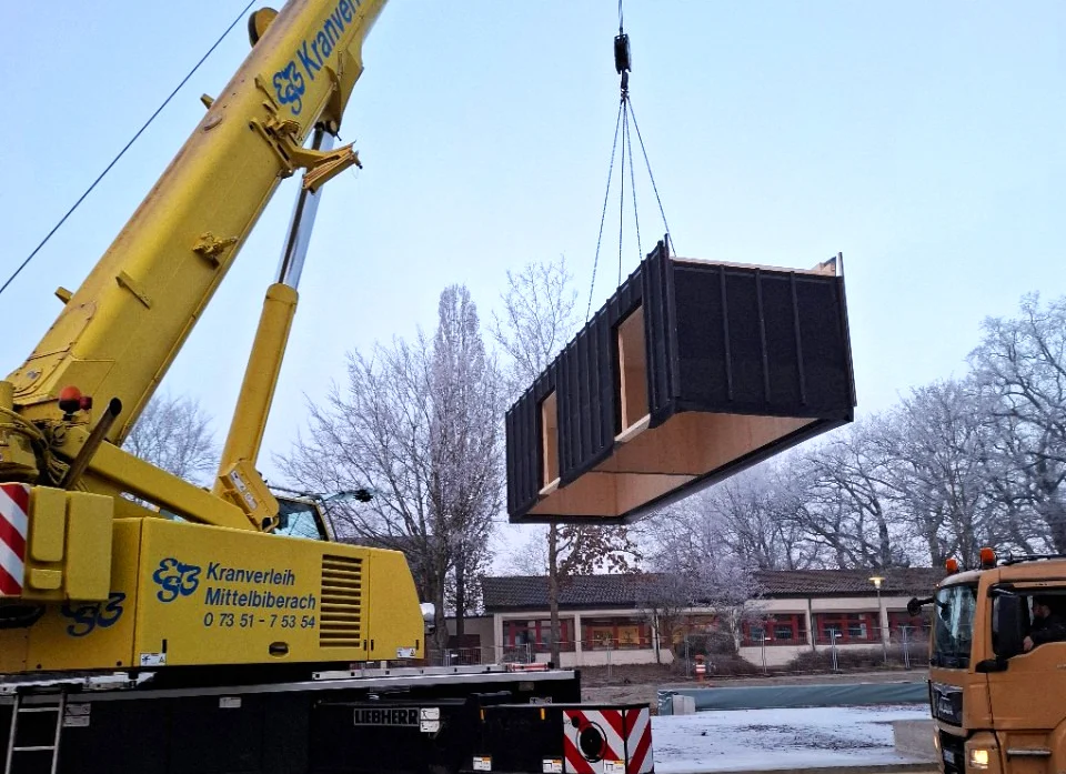Das Nebengebäude wurde als Raummodul in Uttenweiler vorgefertigt, mit einem Tieflader nach Mittelbiberach transportiert und mit einem Mobilkran an Ort und Stelle gesetzt.