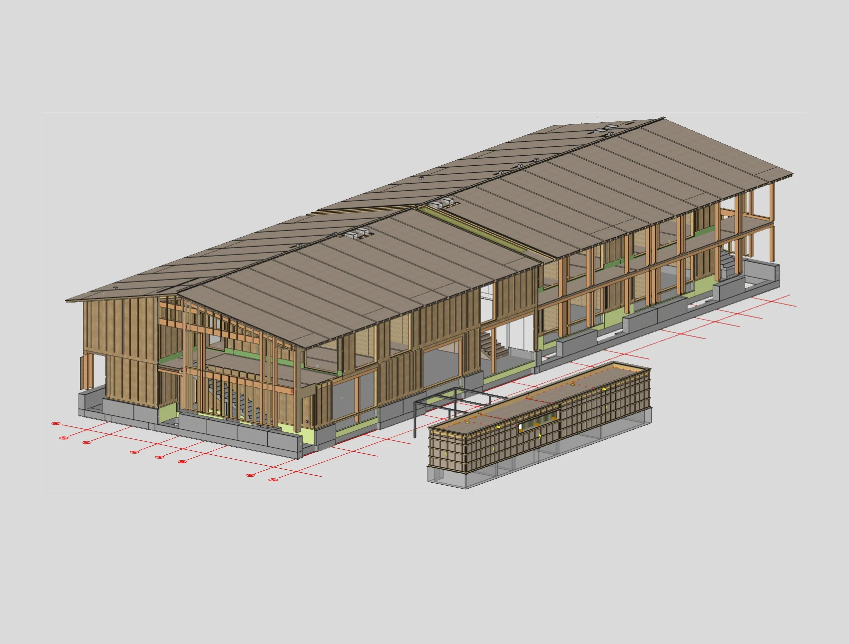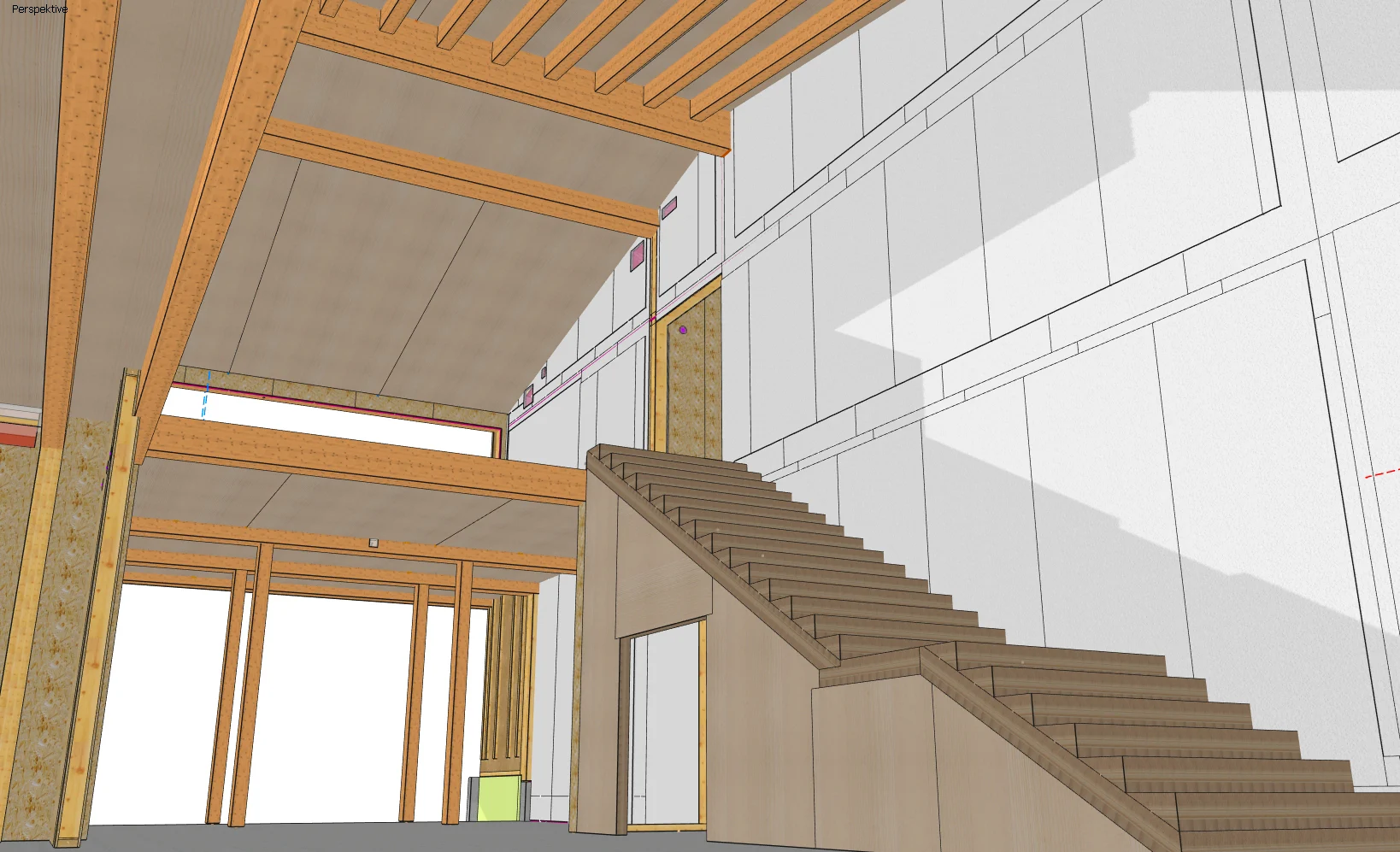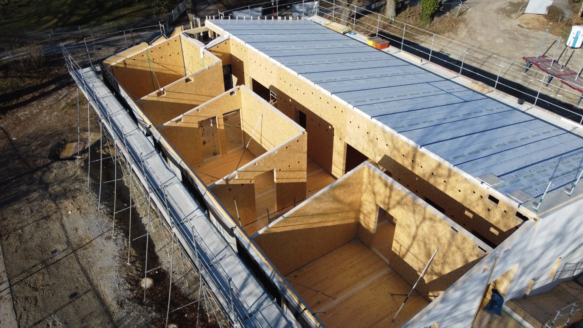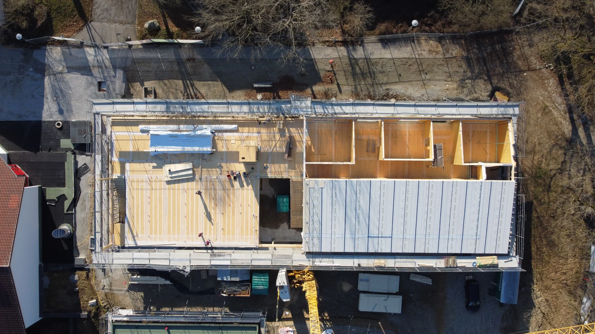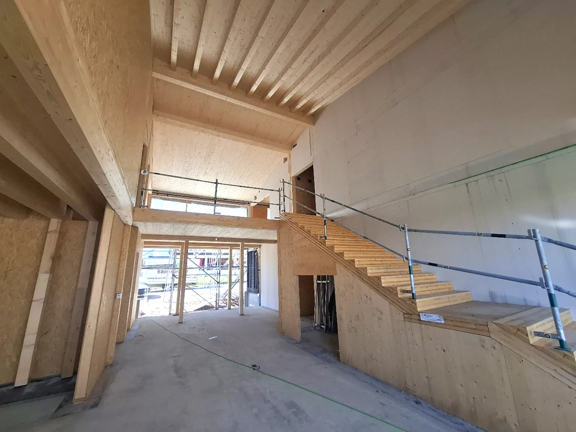 als Rippendecke ausgeführt. Die Wände wurden von uns als Segmente vorelementiert. Die Holzfassade wurde auch von uns vorelementiert und eingehängt. Der Aufzugschacht wurde in Holzbauweise realisiert.